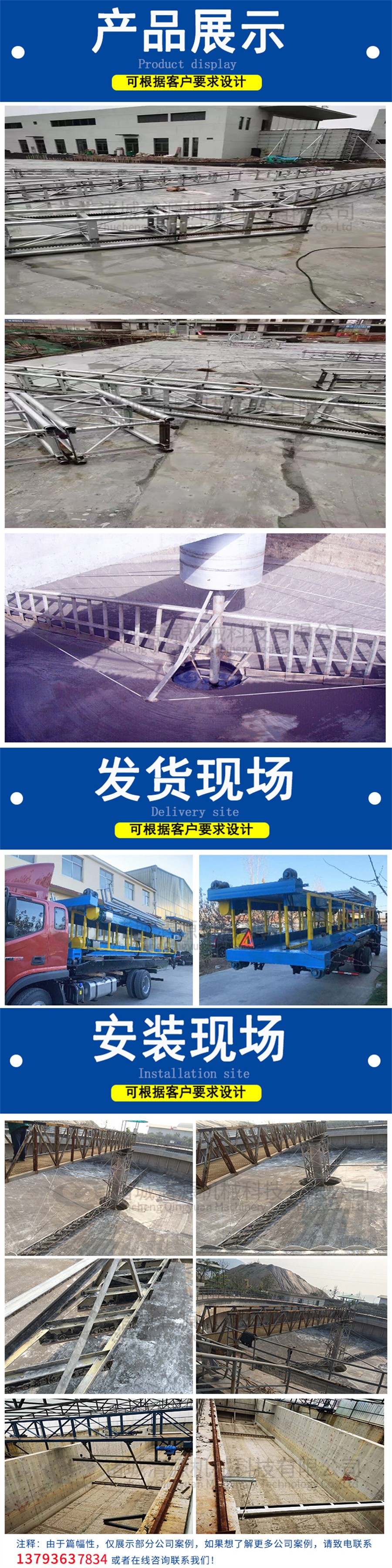 工作橋由安裝在周邊的驅動機構帶動,繞安裝在池中心支墩上的中心支座旋轉,安裝在工作橋上的一組刮泥板在旋轉過程中,將沉淀在池底部的污泥刮向池中心的積泥坑。同時,液面上的浮渣在浮渣刮板和周邊擋渣堰形成的漸縮區域內集中,有浮渣刮耙扒到集渣斗,排至外。
