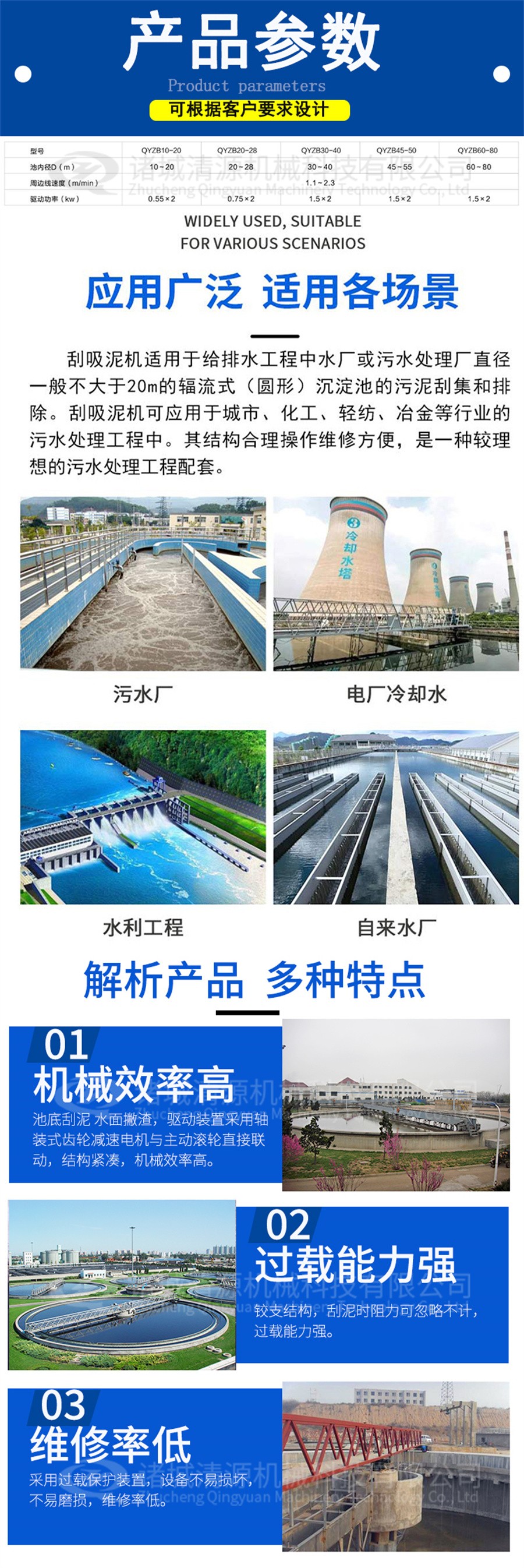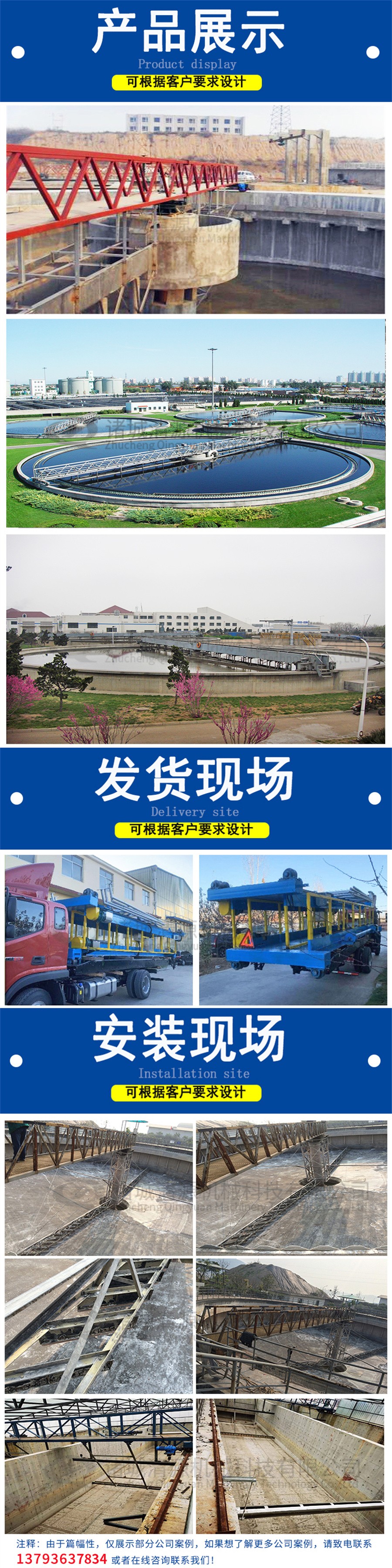 我公司除生產全橋式周邊傳動刮吸泥機外,還生產:桁車式提耙刮泥機,鏈板式刮渣機等其他類型的刮泥機