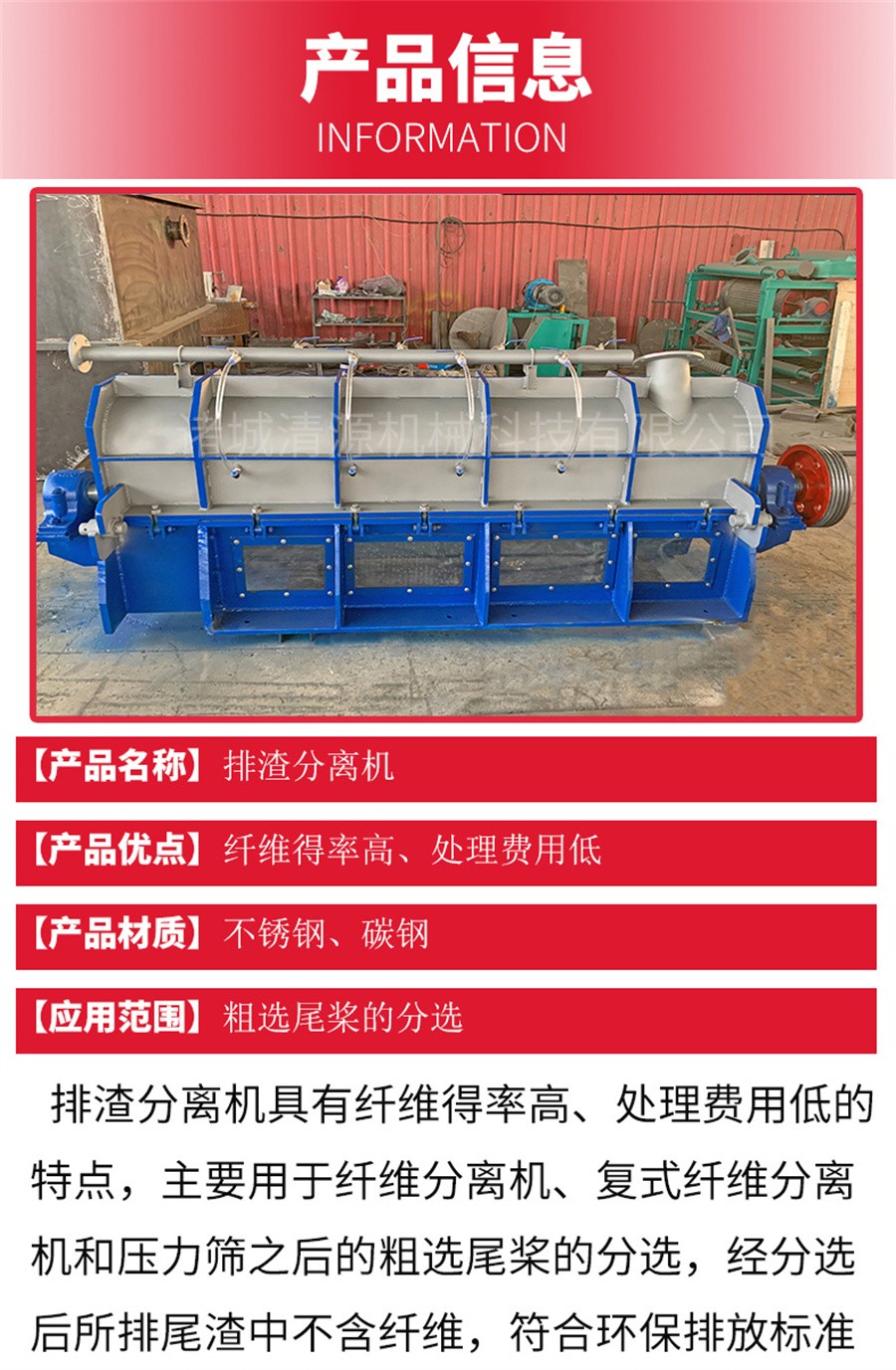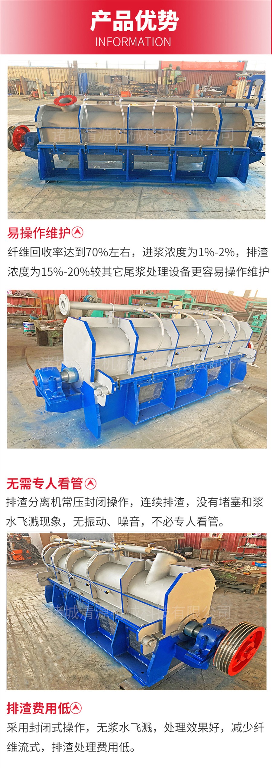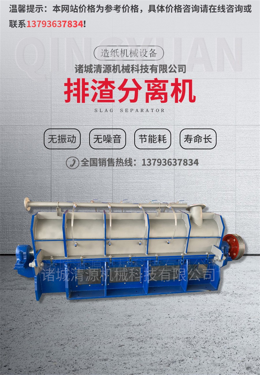 諸城清源機械生產的排渣分離機轉子是帶葉片的長圓柱體結構,葉片靠近設備主體,轉子上葉片的角度是預設定的,為更優化的角度。軸的設計可使傳動皮帶安裝在設備兩端中的任一端。由位于殼體兩側的兩端軸承座支撐轉子。殼體蓋子易于拆卸,易于檢修內部元件,進口管和皮帶輪不需拆下即可檢修轉子或篩板。蓋子上設有防止漿料軸向回流的擋板,由轉子推動漿料向前運動。良漿出口槽和排渣槽都是總體結構的一部分,良漿槽是用來收集濾液的,它的設計增加了設備強度。排渣槽位于進口末端對面的支腿上。帶孔的篩板是半圓柱形的,篩板上的通孔可因使用條件的不同而不同。篩板用螺栓固定在殼體上。